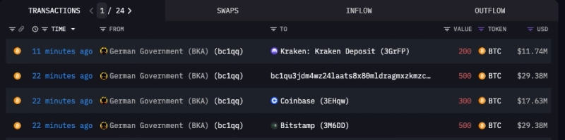 - 아캄인텔리전스 데이터에 따르면 독일 정부로 추정되는 가상자산 주소가 코인베이스, 비트스탬프, 크라켄 등의 거래소에 1000 BTC를 전송했다고 밝혔다.