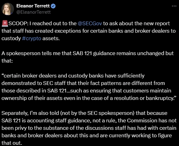 12일(현지시간) 엘레노어 테렛 폭스 비즈니스 뉴스 기자는 X(트위터)를 통해 "특정 은행이나 브로커 딜러는 SAB-121에 명시된 가상자산 커스터디(수탁) 업무와 자신들의 업무가 다르다는 것을 SEC에 입증했다"고 전했다.