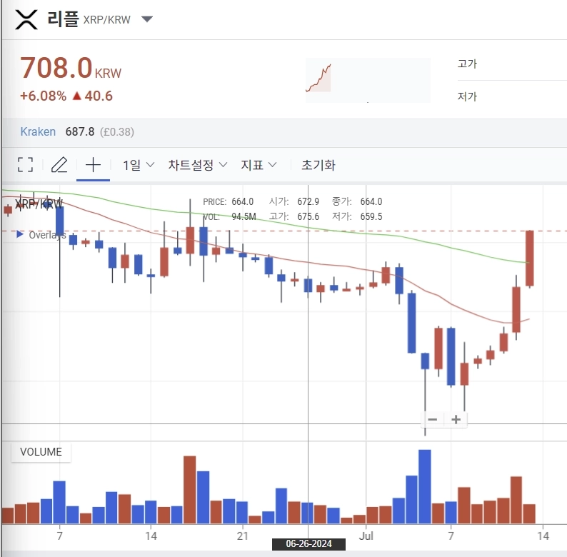 13일 오후 2시 10분 현재 리플은 업비트에서 시가대비 6.08% 상승한 708에 거래되고 있다. 같은시간 빗썸에서도 리플은 전일대비 8.42% 상승한 708원을 기록 중이다.