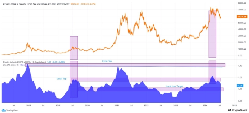 - 비트코인의 aSOPR 지표는 1.05 저항선에 진입했으며, 이에 따라 이전 사이클에서도 조정이 나타났다고 밝혔다.