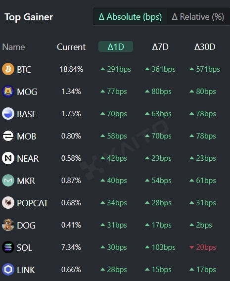 인공지능(AI)기반 웹3 서치 플랫폼 카이토(Kaito)의 토큰 마인드셰어(Token Mindshare, 가상자산 시장 내 특정 토큰의 영향력을 정량화한 지표) 탑게이너에 따르면 15일 현재 사람들이 가장 많이 관심을 보이고 있는 가상자산 관련 키워드 상위 5개는 비트코인(BTC), 모그코인(MOG), 베이스(BASE), 모바일코인(MOB), 니어프로토콜(NEAR) 등이다.