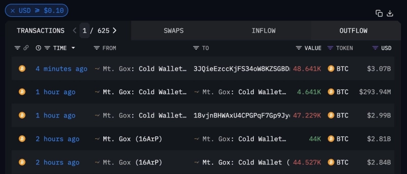16일 온체인 애널리스트 아이(ai_9684xtpa)는 X(옛 트위터)를 통해 "마운틴곡스로 추정되는 지갑주소는 지난 30분간 두 개의 지갑 주소로 약 9만5869 BTC를 이체했다"라고 밝혔다.