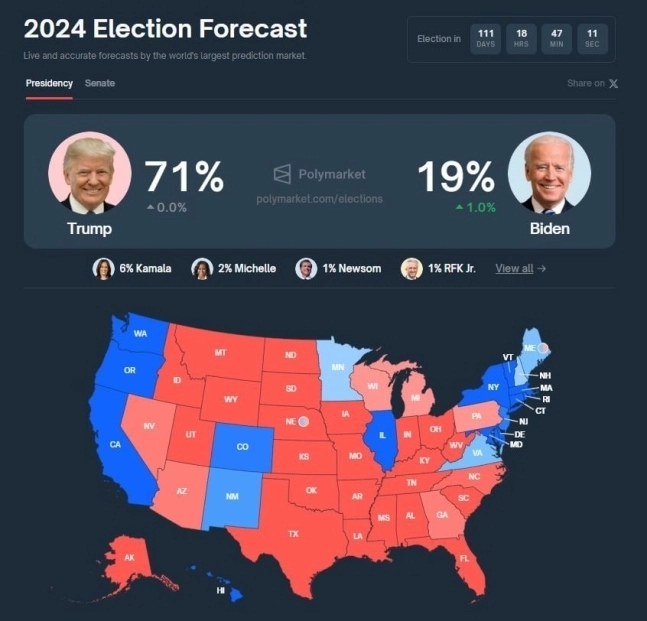 가상자산 기반 예측시장 폴리마켓 데이터에 따르면 트럼프 대통령의 당선 확률은 무려 71%로, 예측시장이 열린 이래 최고치를 기록했습니다. 아직 민주당이 대선 후보를 확정하진 않았지만 바이든 현 대통령, 카멜라 해리스 부통령, 미셸 오바마 전 영부인 등 민주당의 모든 후보의 당선 확률을 합쳐도 당선 확률은 27%에 불과한 상황입니다.