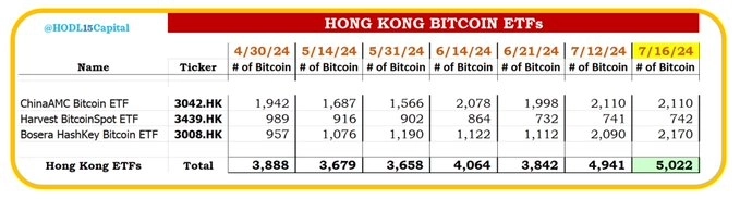 17일 비트코인 분석계정 호들캐피털(HODL15Capital)은 X(옛 트위터)를 통해 "홍콩에 상장된 비트코인 ETF가 보유한 비트코인 물량은 지난 16일 기준 5022 BTC를 기록하며 사상 최고치를 기록했다"라고 전했다.