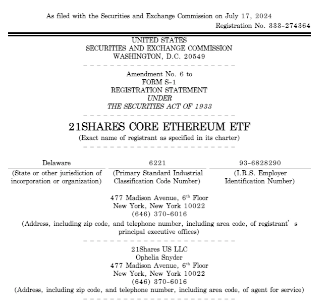 미국의 자산운용사 21셰어즈가 이더리움(ETH) 현물 상장지수펀드(ETF) 증권신고서 수정안을 제출한 것으로 나타났다.