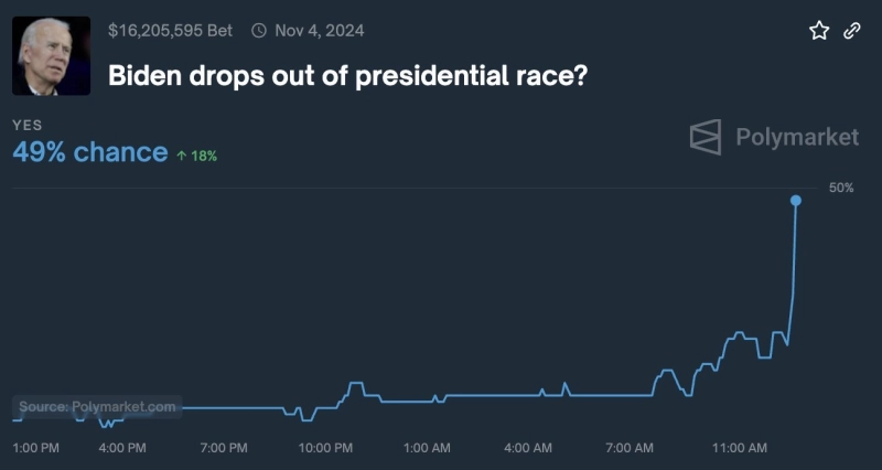탈중앙화 예측 플랫폼인 폴리마켓(Polymarket)에서 조 바이든 후보의 경선 사퇴 확률이 급등하고 있는 것으로 나타났다.
