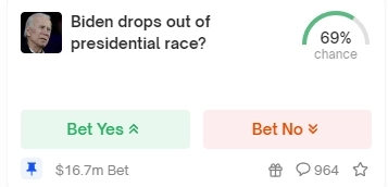 17일(현지시각) 폴리마켓에 따르면 조 바이든 미국 대통령이 경선 후보를 사퇴할 것이라는 확률은 69%를 기록했다. 현재까지 베팅액은 1670만 달러 규모다.