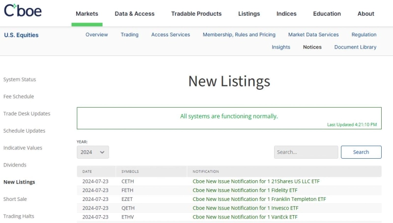 19일(현지시간) 미국 시카고옵션거래소(CBOE)는 이날 공식 웹사이트에 총 5곳의 이더리움 현물 ETF를 리스팅했다. 이날 리스팅 된 이더리움 현물 ETF는 ▲21 셰어즈 CETH, ▲피델리티 FETH, ▲프랭클린템플턴 EZET, ▲인베스코갤럭시 QETH, ▲반에크 ETHV 등이다.