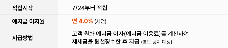 - 빗썸이 가상자산 원화 예치금에 대해 연 4%의 이자를 지급한다고 발표했다.