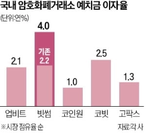 국내 2위 암호화폐거래소 빗썸이 투자자에게 지급하는 예치금 이용료율(이자율)을 연 4.0%로 인상한다. 주요 시중은행의 예·적금은 물론 2금융권 파킹통장(수시입출금식 통장)과 비교해도 높은 수준이다. 신규 고객 확보를 위한 거래소 간 출혈경쟁에 불이 붙은 모양새다.