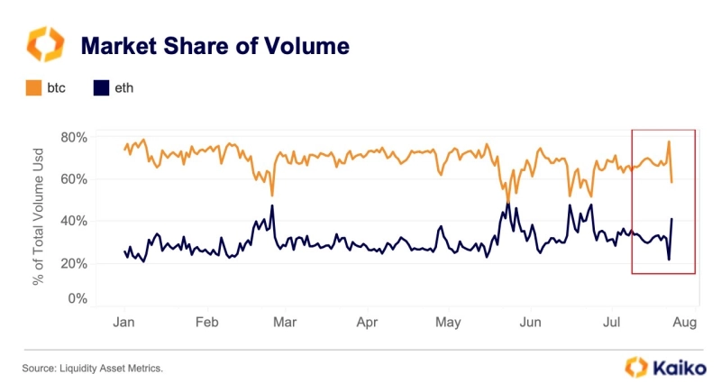 24일 가상자산 데이터 분석 기업 카이코(Kaiko)는 X(옛 트위터)를 통해 "(이더리움 현물 ETF 출시 이후로) 주요 거래소에서 비트코인 대비 이더리움 거래량 비율은 종전의 22%에서 41%로 급증했다. 이더리움 시장에서 거래 활동이 증가하고 있다"라고 밝혔다.