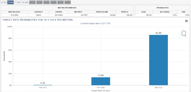25일(현지시간) 미국 시카고상품거래소 페드워치(CME Fedwatch)에 따르면 트레이더들은 미국 연방준비제도(Fed·연준)가 9월에 기준금리를 인하할 확률은 85.8%로 내다보고 있다.