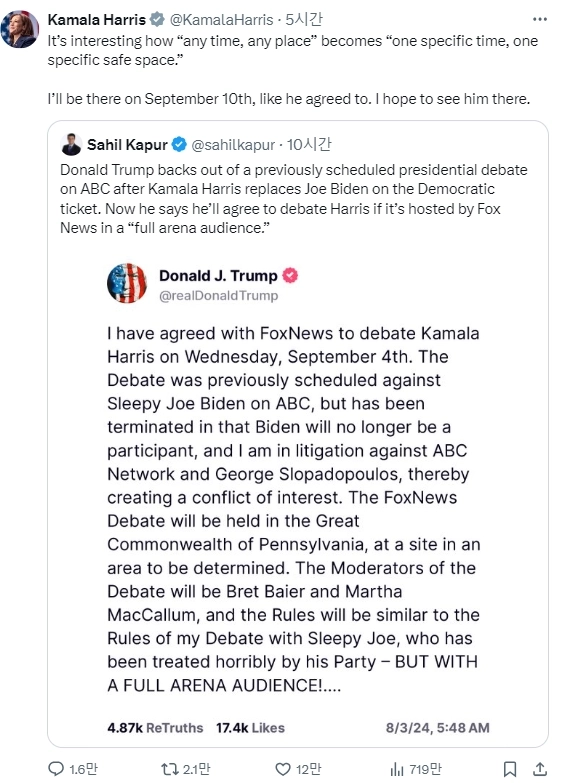 한편 양당 캠프는 당장 내달 초로 다가온 TV 토론의 장소와 시간을 두고 신경전을 벌이고 있다. 트럼프 후보는 당초 바이든 전 대통령과 약속했던 9월 10일 ABC 방송 주최 2차 토론은 후보 교체로 더 이상 유효하지 않다며 9월 4일 폭스뉴스 주최로 펜실베이니아에서 토론을 하겠다고 일방적으로 선언했다. 해리스 후보는 이에 대해 "언제든, 어디서든 한다더니 특정 시간, 특정한 장소에서 안전하게 하겠다는 말로 바뀌는 걸 보는 게 흥미롭다"고 맞받았다. 양측의 입장이 좁혀지지 않으면 2차 TV 토론은 무산될 가능성도 있다.