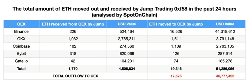 - 점프 트레이딩이 지난 24시간 동안 1만7576 ETH를 중앙화 거래소로 입금한 것으로 나타났다.