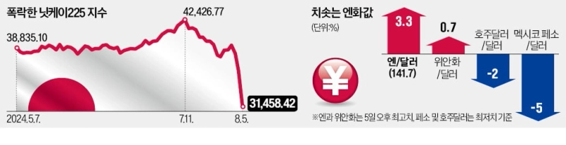 7개월 만의 달러 대비 엔화 강세가 글로벌 ‘머니 무브’를 촉발해 전체 지수 낙폭을 키웠다는 분석이 나온다. 이날 도쿄 외환 시장에선 엔·달러 환율이 142엔까지 내렸다. 올해 1월 초 이후 가장 높은 수준이다. 일본 기준금리 인상에 시장이 반응한 결과다. 일본은행이 지난달 31일에 이어 조만간 추가 기준금리 인상에 나설 것이 유력하다는 관측이다. ‘슈퍼 엔저’ 기조가 깨진 셈이다. 엔화 절상은 일본 내 기업들의 수출 실적을 꺾을 수 있어 악재로 평가된다.