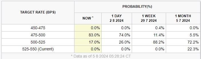 - CME페드워치에 따르면, 연준이 9월에 50bp 금리 인하를 단행할 확률이 83%에 달하는 것으로 전망된다고 밝혔다.