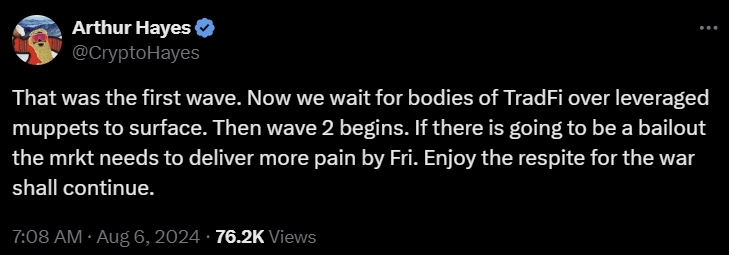6일(현지시간) 아서 헤이즈는 자신의 X(옛 트위터)를 통해 "증시 급락은 첫 번째 물결이었다. 이제 레버리지를 이용한 멍청이들 위에 있는 전통 금융 기관들의 시체가 수면 위로 떠오를 것이며, 이후 두 번째 물결이 시작될 것"이라고 말했다.