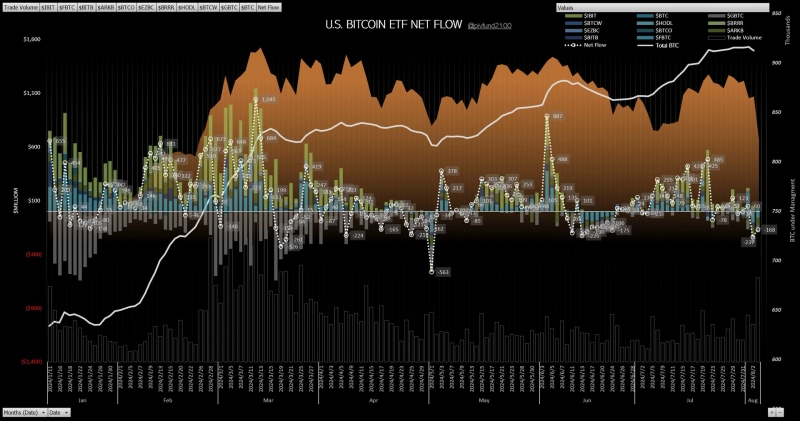 구체적으로 그레이스케일 GBTC에서 6910만달러가 순유출됐고, 피델리티 FBTC는 5800만달러, 아크&21셰어즈의 ARKB는 6900만달러가 순유출됐다. 이날 블랙록은 21거래일만에 순유입 '0'를 기록했다.