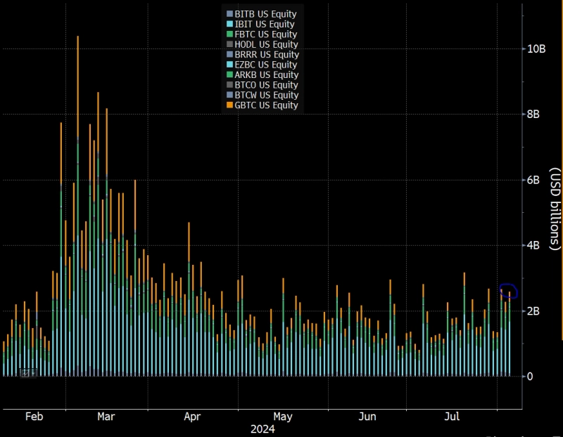 미국 비트코인(BTC)과 이더리움(ETH) 현물 ETF가 어제 증시 혼란 가운데 60억달러에 가까운 거래량을 기록했다.
