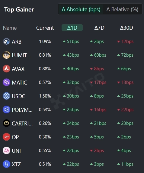 인공지능(AI)기반 웹3 서치 플랫폼 카이토(Kaito)의 토큰 마인드셰어(Token Mindshare, 가상자산 시장 내 특정 토큰의 영향력을 정량화한 지표) 탑게이너에 따르면 6일 현재 사람들이 가장 많이 관심을 보이고 있는 가상자산(암호화폐) 관련 키워드 상위 5개는 아비트럼(ARB), 루미테라, 아발란체(AVAX), 폴리곤(MATIC), USD코인(USDC) 등이다.