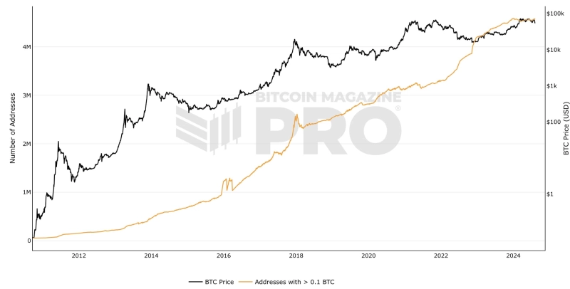 0.1BTC 이상을 보유한 지갑이 사상 최고치에 근접한 것으로 나타났다.