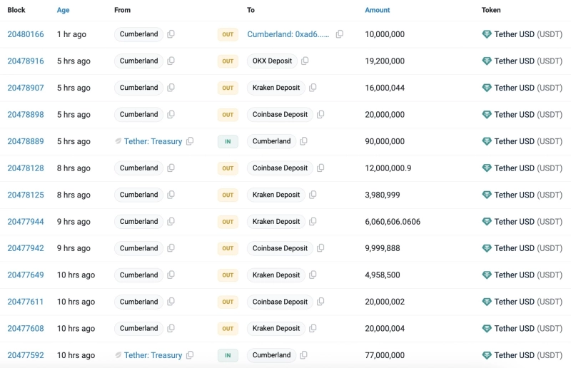 7일(현지시각) 룩온체인은 X를 통해 "기관들은 저점에 매수 중"이라며 "이틀 동안 컴벌랜드는 테더 트레저리 주소로부터 3억7200만USDT를 받아 중앙화거래소로 이체했다"라고 전했다.