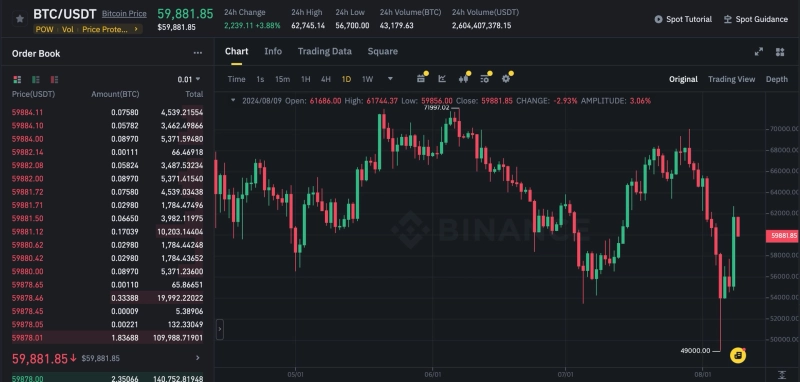 현재 비트코인은 바이낸스 테더(USDT) 마켓에서 하락세로 전환하며 전일 대비 약 3%가 떨어진 5만9800달러대에 거래되고 있다.