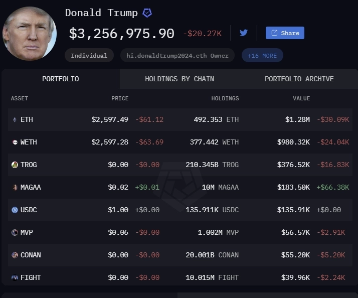 트럼프 토큰(MAGA), 트로그(TROG) 비롯해 해당 주소가 보유하던 가상자산이 급락하면서 해당 주소 보유 가상자산 가치가 급락한 것으로 분석된다. 트럼프 토큰은 지난 두 달 동안 약 70% 하락했고, 같은 기간 트로그도 90% 넘게 내렸다.