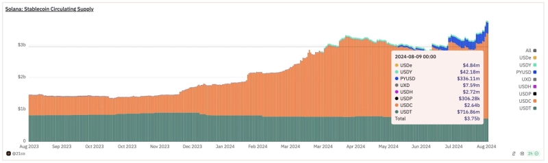 - 솔라나 네트워크 기반의 스테이블코인 발행량이 156% 상승한 것으로 보고되었다 전했다.