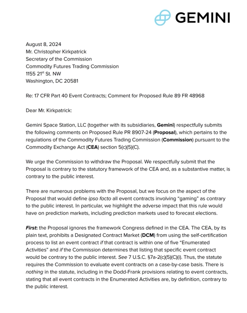 - 제미니는 미국 CFTC에 탈중앙화 예측 플랫폼을 금지하는 규제안을 통과시켜서는 안된다는 서한을 전송했다고 밝혔다.