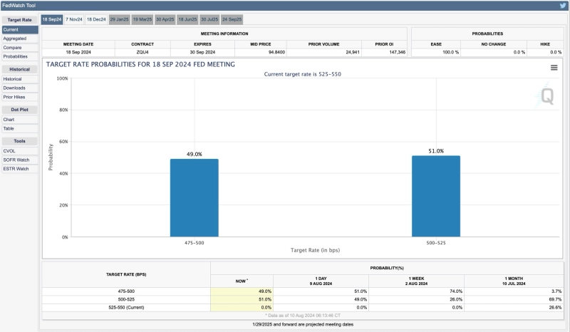 시카고파생삼품거래소그룹(CME Group)이 제공하는 패드워치툴이 미국 연방준비제도(Fed)의 9월 빅컷(0.5%p 금리 인하) 확률을 49%로 조정했다.