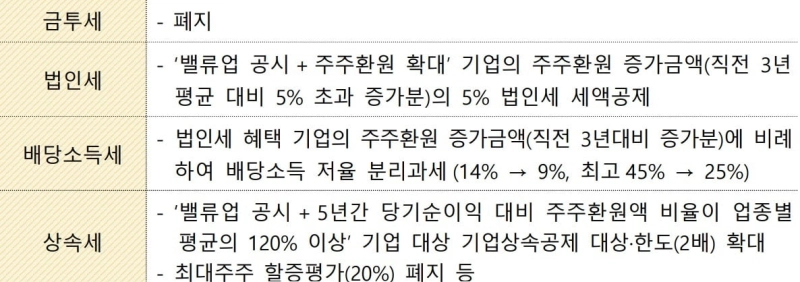 - 금투세 폐지 및 밸류업 관련 세제지원 방안이 차질 없이 추진될 수 있도록 국회 논의를 적극 지원하겠다고 밝혔다.