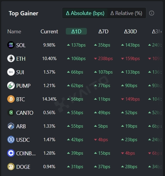 인공지능(AI) 기반 웹3 서치 플랫폼 카이토(Kaito)의 토큰 마인드셰어(Token Mindshare, 가상자산 시장 내 특정 토큰의 영향력을 정량화한 지표) 탑게이너에 따르면 12일 현재 사람들이 가장 많이 관심을 보이고 있는 가상자산(암호화폐) 상위 키워드 5개는 솔라나(SOL), 이더리움(ETH), 수이(SUI), 펌프펀(PUMP), 비트코인(BTC) 등이다.