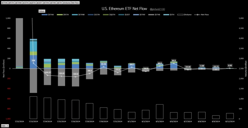 13일(현지시간) 트레이더T에 따르면 전날 이더리움 현물 ETF에 약 490만달러(한화 약 67억원)이 순유입됐다. 앞서 지난 9일 이더리움 현물 ETF는 약 1570만달러의 순유출을 기록했으나, 1거래일만에 순유입으로 전환된 모습이다.