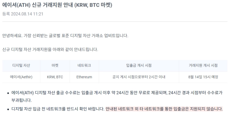 가상자산 거래소가 신규상장을 발표했다. 14일 업비트는 오늘 15시 에이셔(ATH)를 원화, BTC마켓에 동시 상장한다고 밝혔다.
