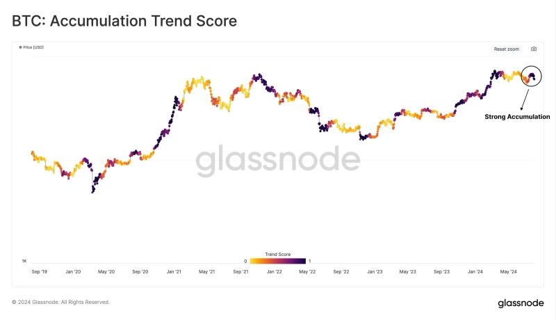 매체는 "비트코인 매집 추세 지수(Accumulation Trend Score)에 따르면 지난 달 매집 활동은 크게 일어났다"라며 "지난 3개월 동안 37만4000 BTC가 장기 보유자의 지갑으로 들어갔다"라고 전했다.