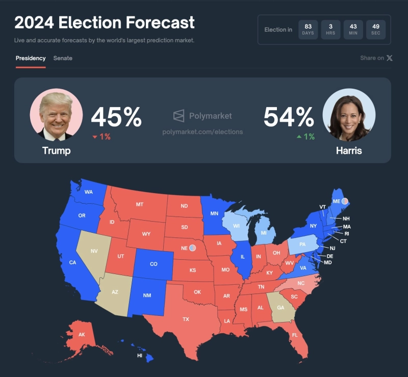 - 탈중앙화 예측 플랫폼 폴리마켓에 따르면 해리스는 트럼프에 비해 9% 앞서고 있다고 밝혔다.