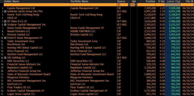 14일(현지시각) 금융 인플루언서인 제로헷지(ZeroHedge)는 X를 통해 "2분기 IBIT를 가장 많이 매수한 구매자들"이라고 밝혔다. 도표에 따르면 1위는 유럽 헤지펀드인 카풀라 인베스트먼트 매니지먼트가 차지했고, 2위는 골드만삭스가 위치했다.