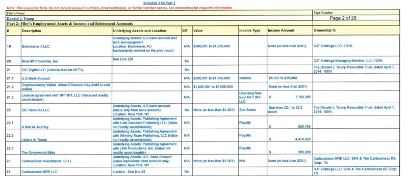 - 도널드 트럼프 전 대통령이 500만달러 규모의 가상자산을 보유하고 있는 것으로 전했다.