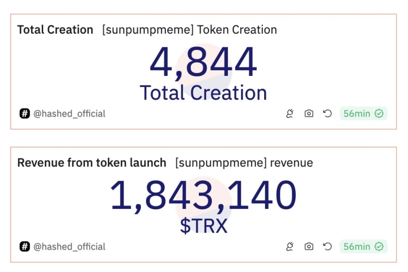 트론(TRX) 기반 밈코인 발행 플랫폼 선펌프(SUN PUMP)가 출시 이후에 184만 TRX(약 24만6000달러)의 수익을 올린 것으로 나타났다.