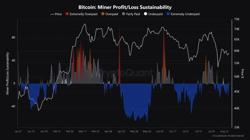 20일(현지시간) 크립토퀀트 저자 IT 테크는 "비트코인 '채굴자 손익 지속성'과 '채굴자 일단위 보상' 지표 상 현재 채굴자들은 수익과 손실의 분기점에 위치하고 있다"며 "비트코인 가격이 5만9000달러선 이상을 유지한다면 채굴업자들이 시장에 매도 압력을 가할 가능성이 적다"고 전했다.