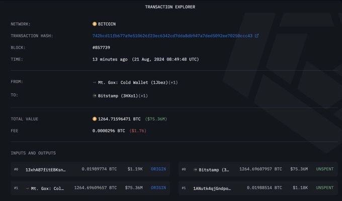 - 최근 마운트곡스가 비트스탬프 거래소로 1264 BTC를 이체한 것으로 나타났다고 밝혔다.