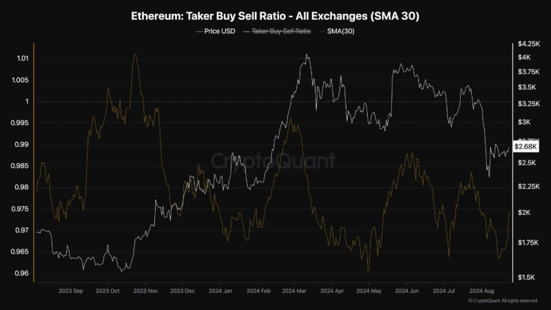 - 선물 시장가 매수 및 매도 비율 지표가 이더리움의 가격 상승을 시사하고 있다고 밝혔다.