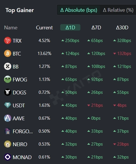 인공지능(AI)기반 웹3 서치 플랫폼 카이토(Kaito)의 토큰 마인드셰어(Token Mindshare, 가상자산 시장 내 특정 토큰의 영향력을 정량화한 지표) 탑게이너에 따르면 26일 현재 사람들이 가장 많이 관심을 보이고 있는 가상자산(암호화폐) 관련 키워드 상위 5개는 트론(TRX), 비트코인(BTC), 바운스비트(BB), 프워그(FWOG), 도그스(DOGS) 등이다.