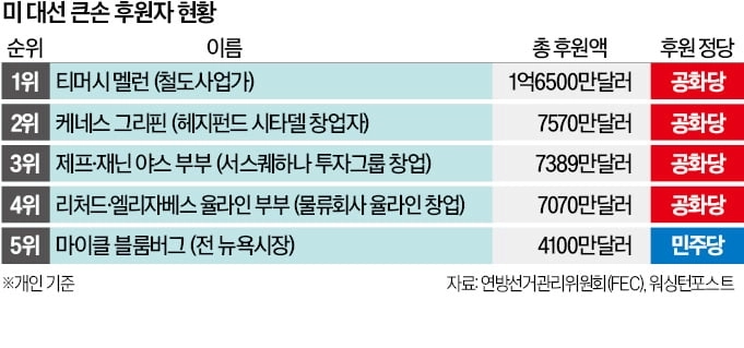 이 명단에 따르면 올해 선거의 1위 후원자는 팬암(옛 GTI) 등 철도회사 창업자이자 BNY멜런은행 그룹을 설립한 토머스 멜런의 자손 티머시 멜런이다. 멜런가(家)의 자산 규모는 141억달러(약 18조7000억원)로 추정된다. 할아버지인 앤드루 멜런은 1921\~1932년 미국 재무장관을 지냈다.
