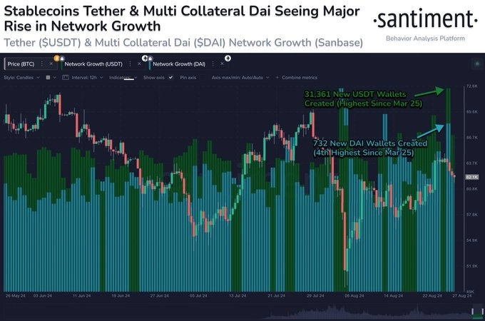 27일(현지시각) 샌티멘트는 X를 통해 "테더(USDT) 네트워크의 신규 지갑 생성은 5개월 만에 최고치"라며 "하루에 3만1300개 이상의 지갑이 생성되고 있다"라고 밝혔다. 이어서 "다중 담보 다이(Multi Collateral Dai) 또한 네트워크 성장세가 증가하고 있다"라며 "이는 새로운 자금이 가상자산 시장에 유입되는 것을 나타낸다"라고 전했다.