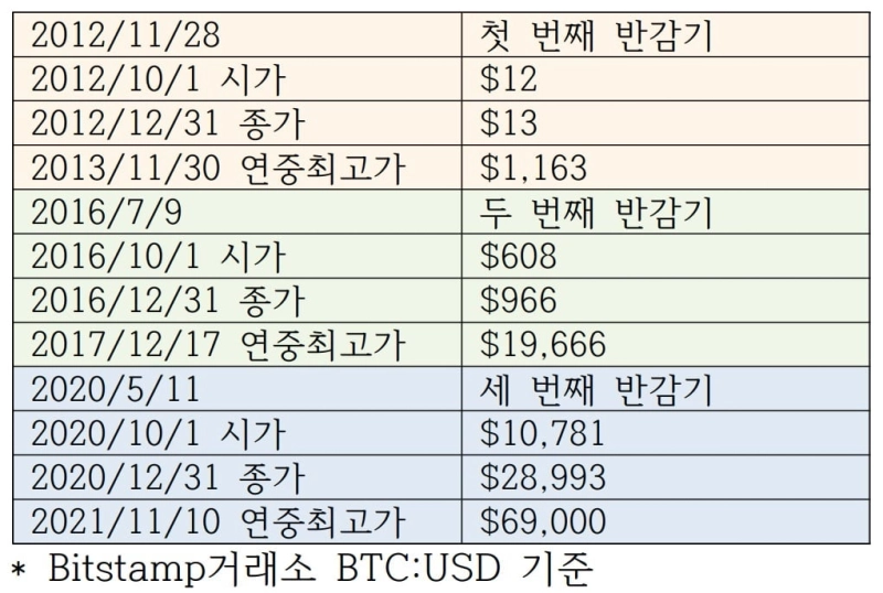 2012년, 2016년, 2020년 모두 비트코인 반감기와 미국 대통령 선거가 있었던 해다. 우연히도 세 해 모두 마지막 분기 동안 유의미한 가격 상승, 그리고 다음 해 연말까지 폭발적인 가격 상승이라는 패턴이 관측되었다.