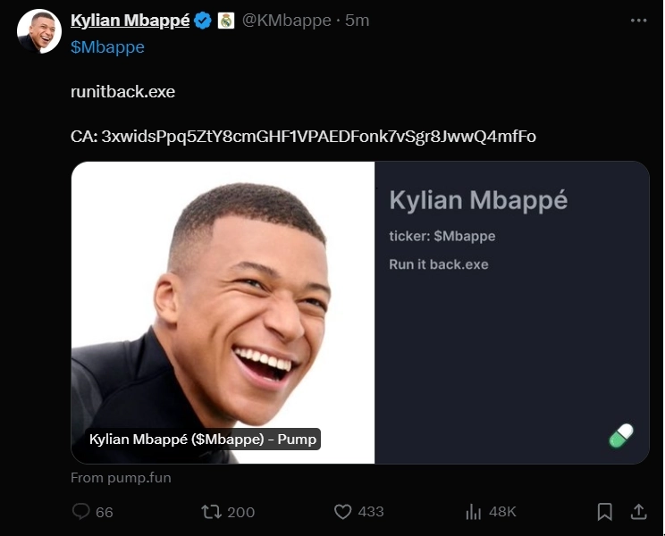 28일(현지시각) 우블록체인에 따르면 음바페의 공식 X 계정은 해킹을 당해 MBAPPE(음바폐) 토큰을 홍보했다. 이 홍보글로 인해 음바페 토큰의 시가총액은 몇 분 만에 수천만 달러까지 상승한 뒤 급락했다.