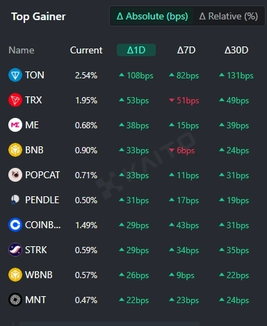 인공지능(AI)기반 웹3 서치 플랫폼 카이토(Kaito)의 토큰 마인드셰어(Token Mindshare, 가상자산 시장 내 특정 토큰의 영향력을 정량화한 지표) 탑게이너에 따르면 29일 현재 사람들이 가장 많이 관심을 보이고 있는 가상자산 관련 키워드 상위 5개는 디오픈네트워크(TON), 트론(TRX), 매직에덴(ME), 바이낸스코인(BNB), 팝캣(POPCAT) 등이다.