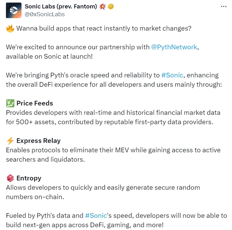 레이어1 블록체인 소닉랩스(전 팬텀)가 30일(현지시간) X(구 트위터)를 통해 오라클 솔루션 피스 네트워크(Pyth Network)와 파트너십을 체결하고, 개발자에게 피스 데이터 소스를 제공한다고 발표했다.